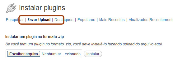 Este método consiste em ter um plugin salvo no seu computador e envia-lo para o sistema de sua loja virtual. Normalmente o plugin tem o nome do arquivo como este woocommerce-pagseguro.zip. Para enviar o arquivo basta clicar Plugins, selecionar a opção Adicionar novo e no link Fazer Upload e escolher o plugin no seu computador. Veja exemplo.